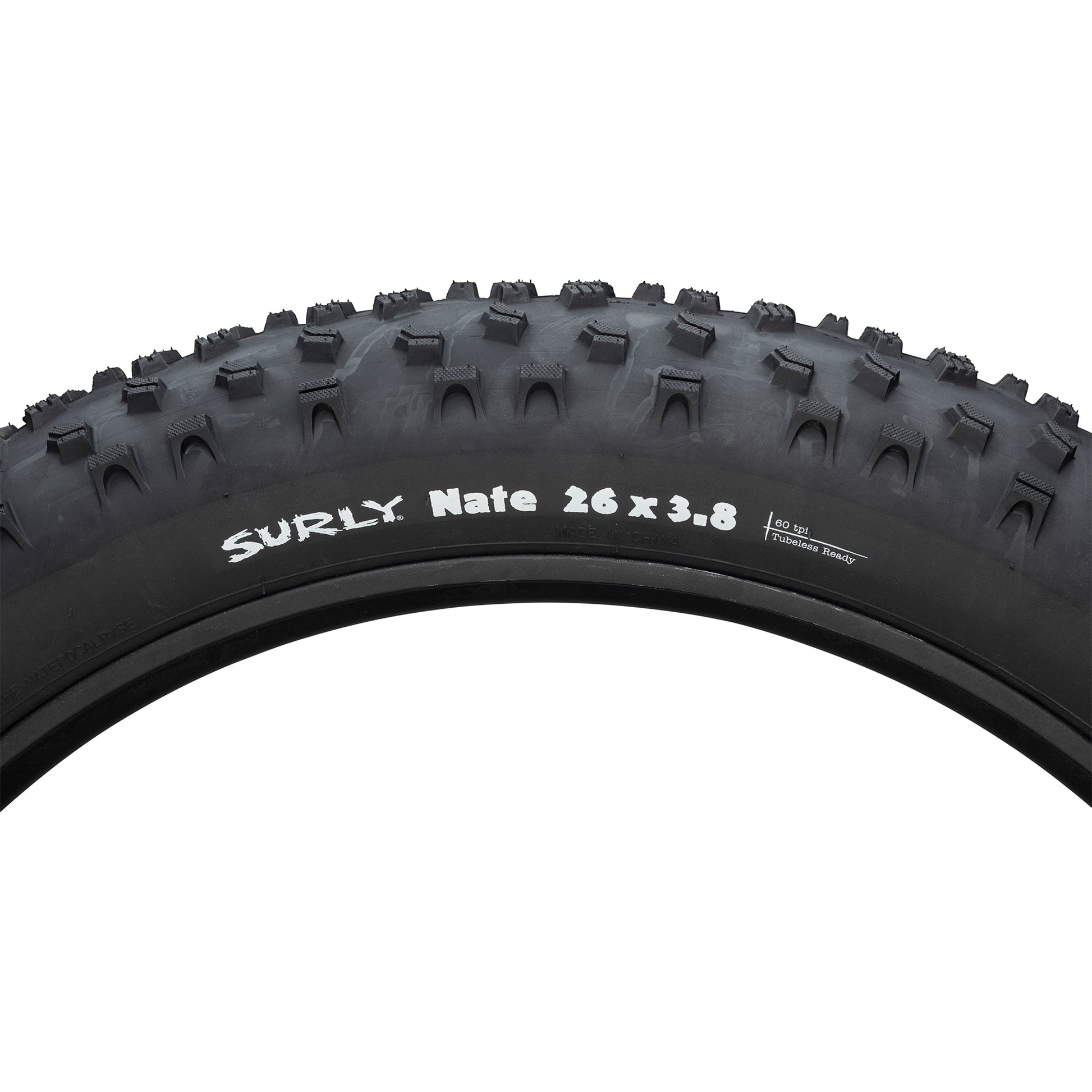 We named this tire for our friend Nate, who is also quite large and aggressive. This tire has a shred-your-face-off, run-over-anything, kung fu grip knobby tread pattern. The casing is round and supple. Tall, widely-spaced knobs are siped for added grip and compliance. The knobs’ wide spacing means they dig deep and still shed the crap you’re riding through. The tread wraps a little around the sides of the tire, providing good knob contour even on very wide rims, which in turn allows good off-camber traction.