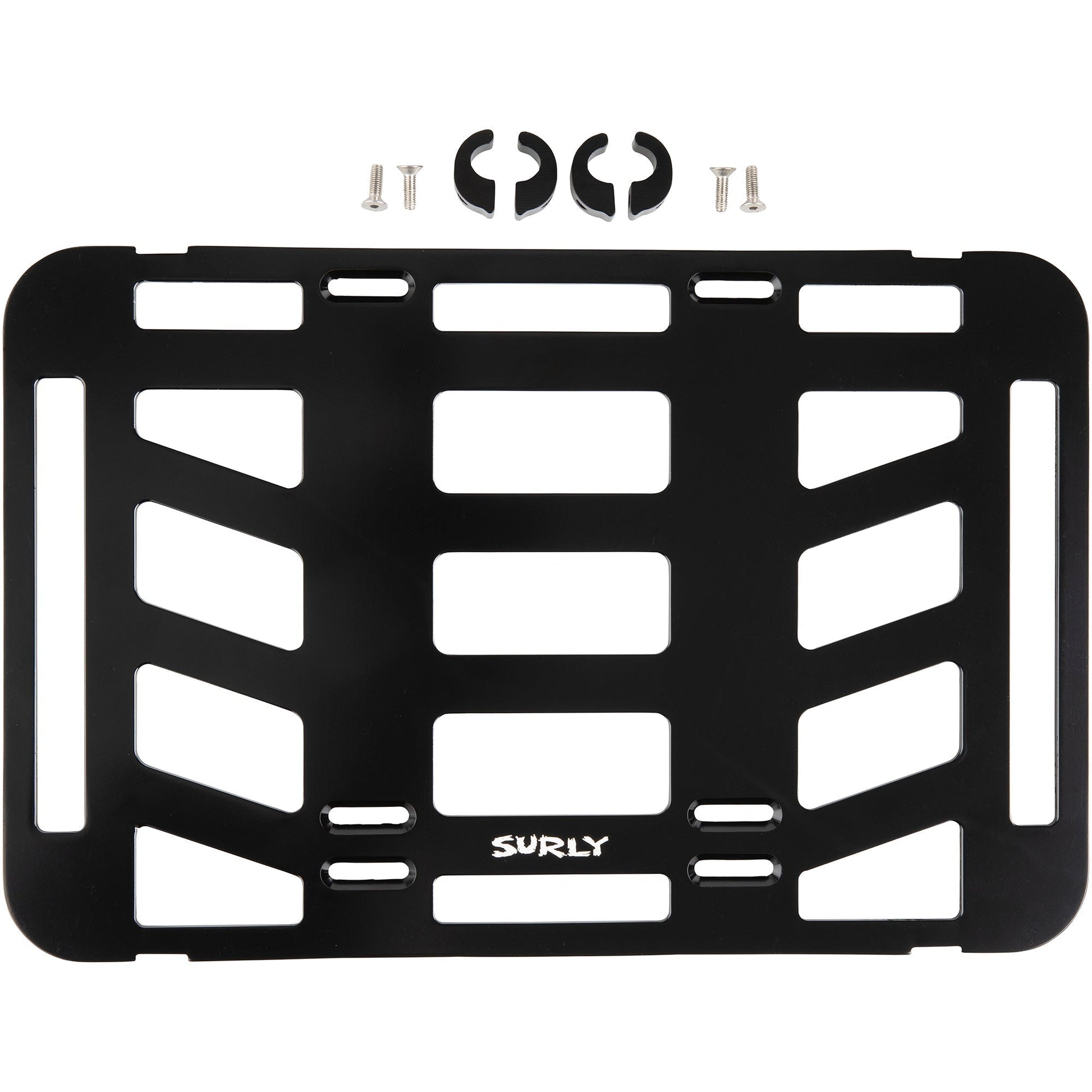 We designed the Surly TV Tray to help riders boost the capacity of their current rack setups. Designed for easy pairing with nearly all Surly racks and most other racks on the market, mount this sturdy aluminum platform on top of your current rack to provide a footprint large enough for 30 lbs. of beef jerky, 9-volt batteries, used pinball parts, or whatever else you might need to haul. Available in dark black.